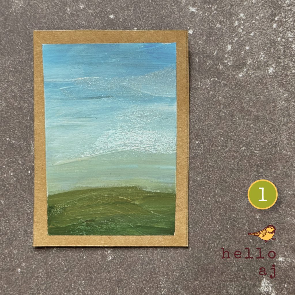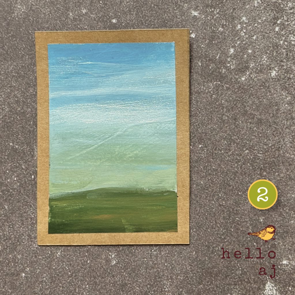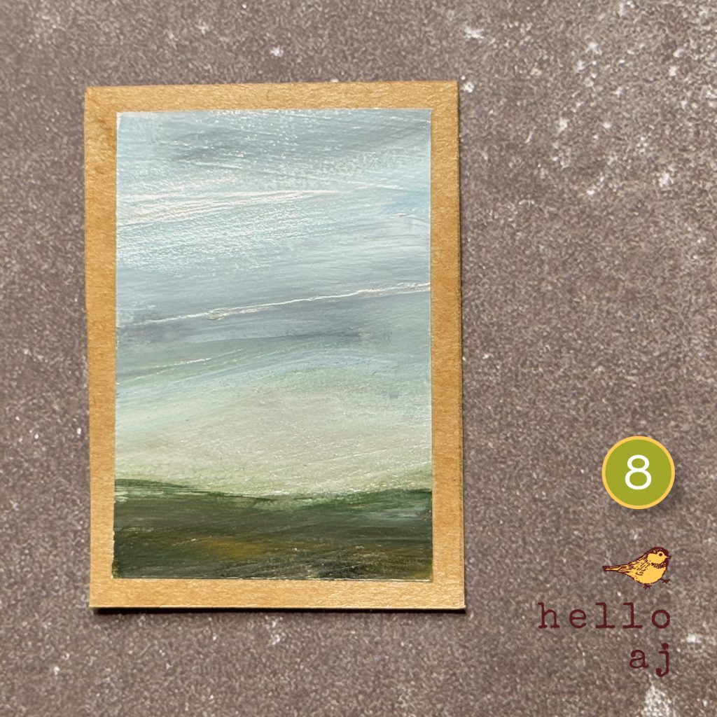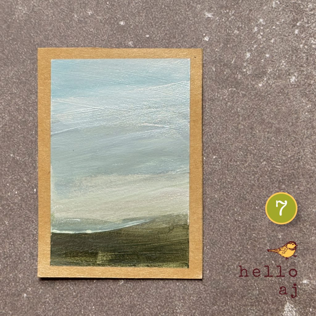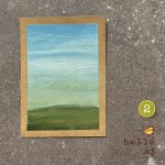 Each card is an original acrylic painting on heavy paper, 2.5″ x 3.5″ standard ACEO size, with a natural kraft border. Blues, greens, and whites — some cards lean bright and clear, others a little more overcast. No two are identical.