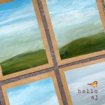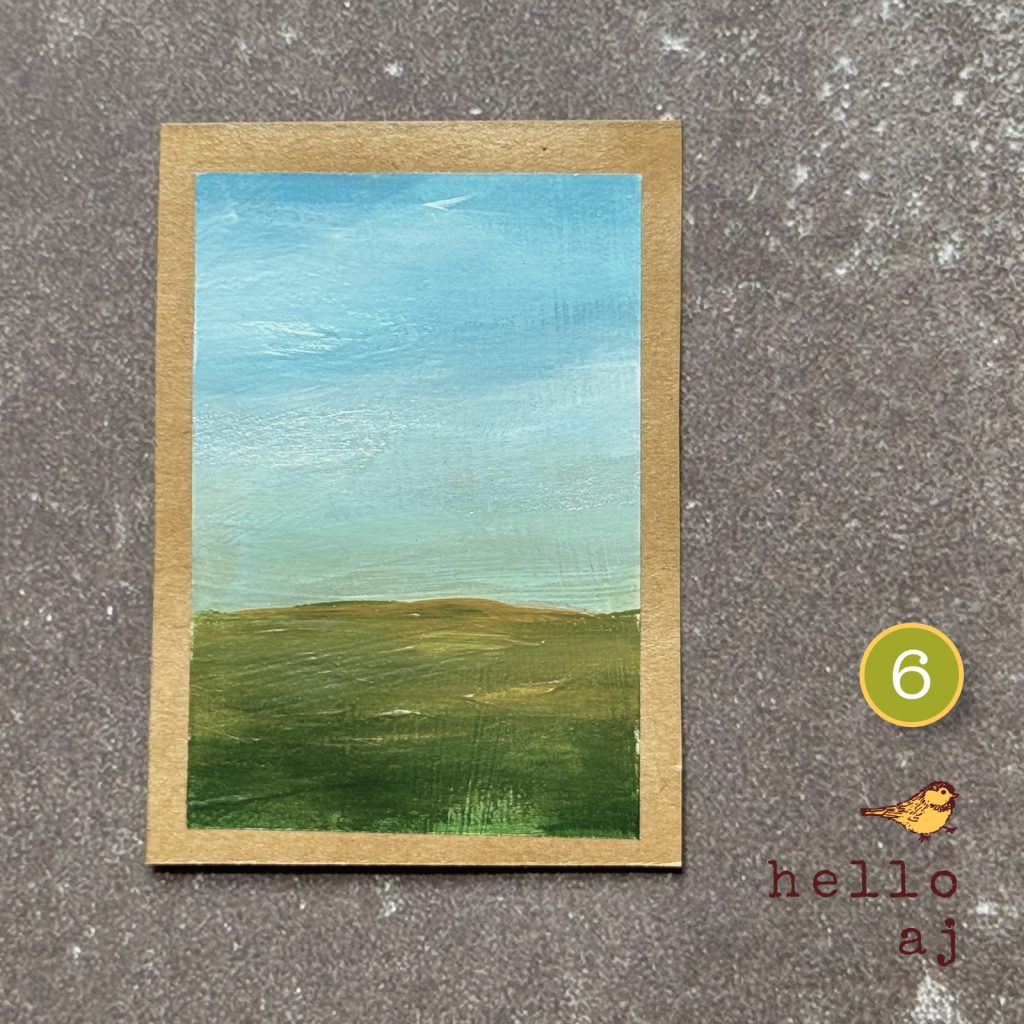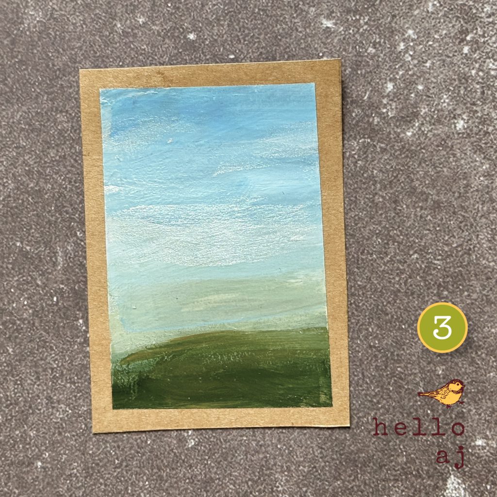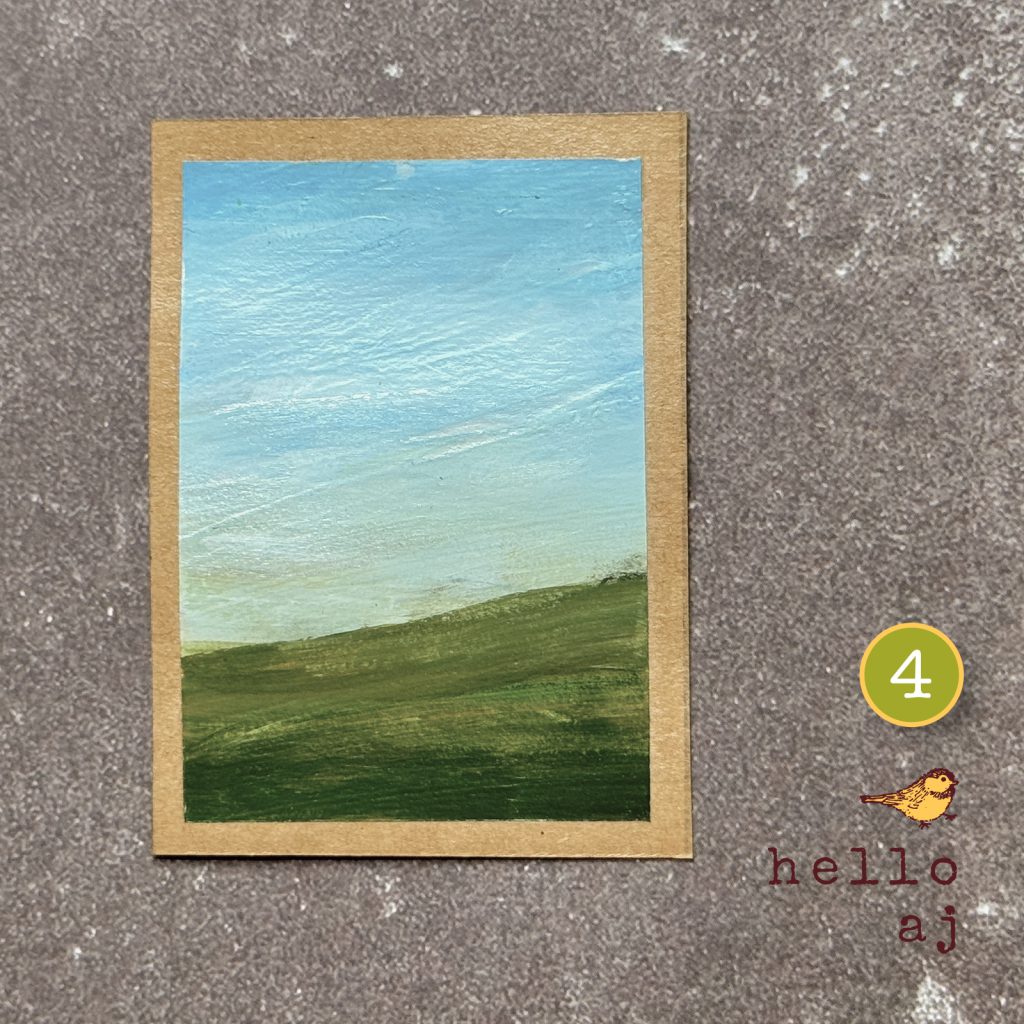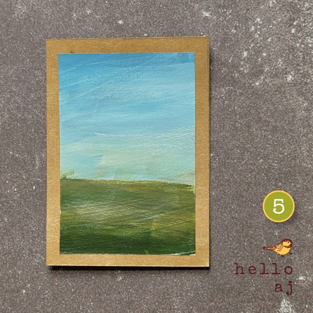 Each card is an original acrylic painting on heavy paper, 2.5″ x 3.5″ standard ACEO size, with a natural kraft border. Blues, greens, and whites — some cards lean bright and clear, others a little more overcast. No two are identical.