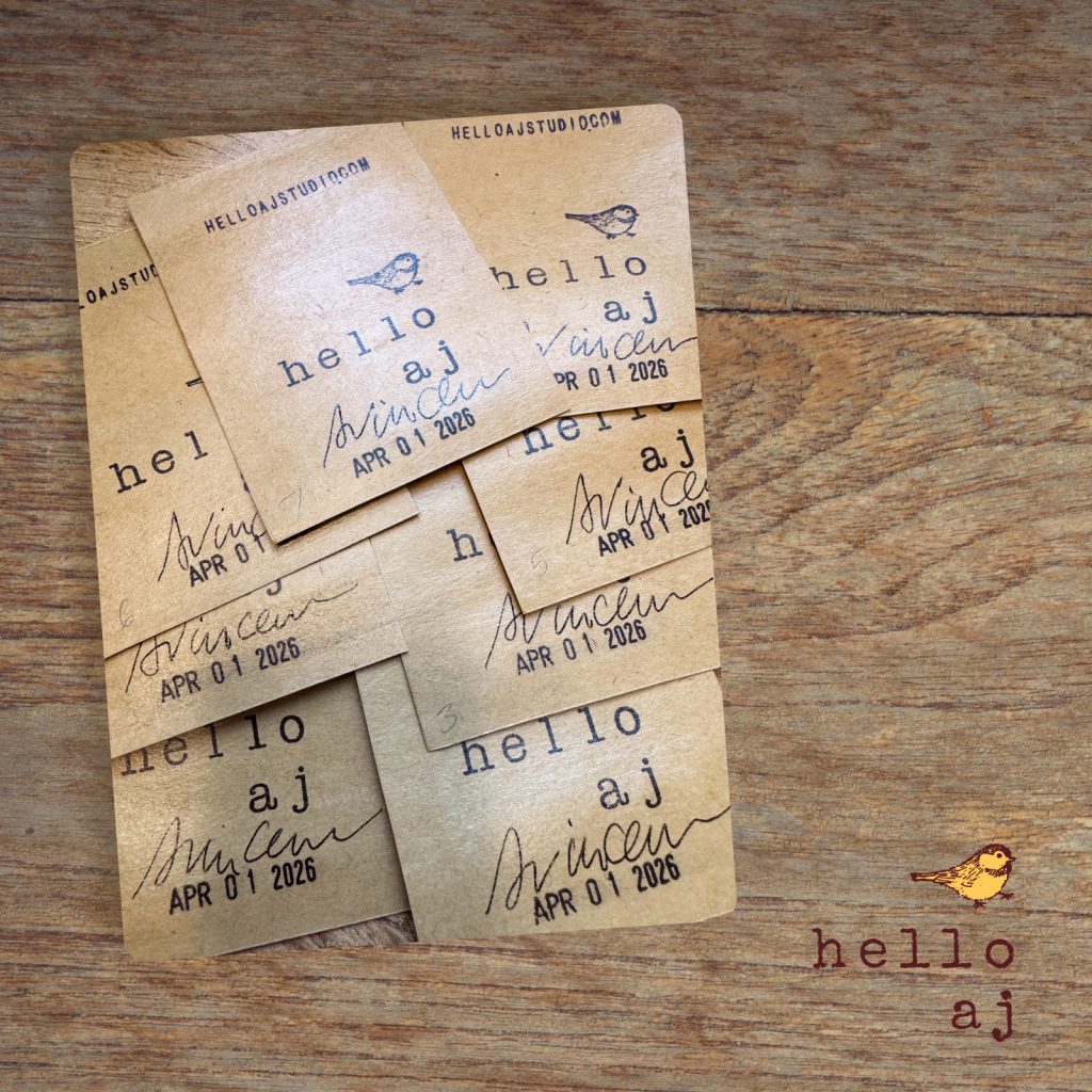Signed, dated, and stamped with the hello.aj bird mark and website on the back.