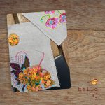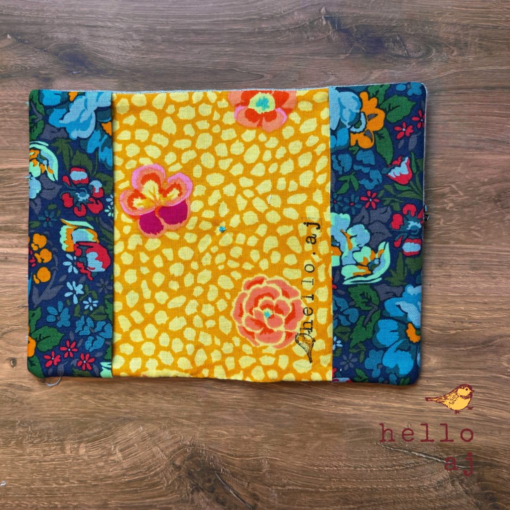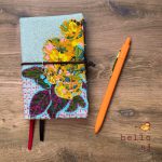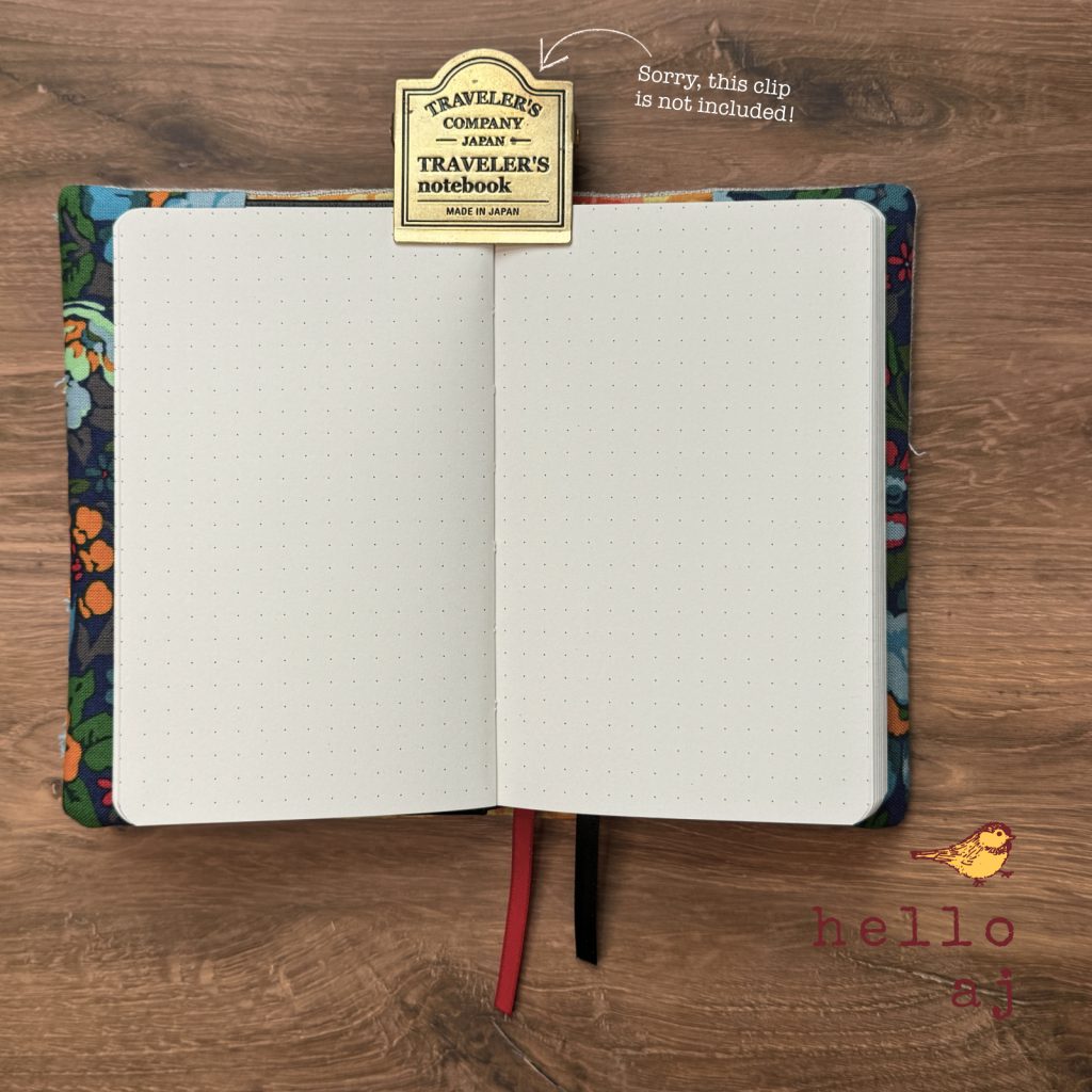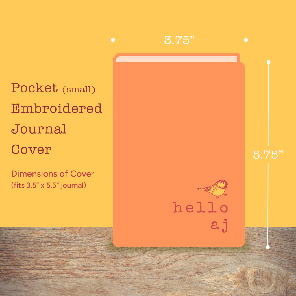 Fits a 3.5″ x 5.5″ hardcover journal, including pocket-sized Moleskine size. A hardcover dot grid notebook is included — not a branded journal, but a quality notebook ready to write in. The interior is [LINING COLOR] with dark blue floral inner flaps. Also includes an orange click pen with gold clip and black ink. The cover is reusable — swap in a new journal when you’re done. Stamped hello.aj inside back cover.