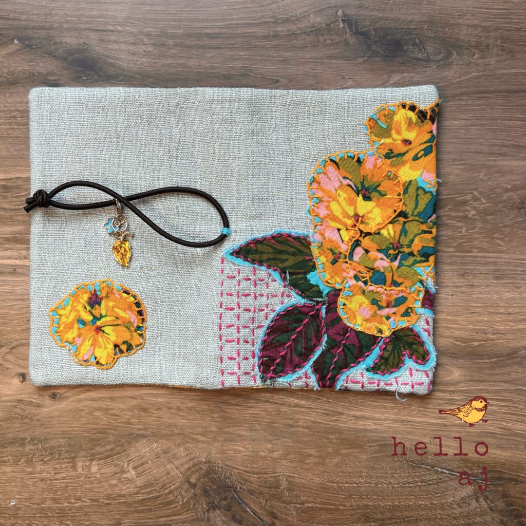 The exterior is natural undyed linen with raw edge applique cotton flowers in yellow, orange, and pink, with dark green and magenta leaves. Flowers are outlined in blanket stitch; leaves in wrapped backstitch. A pink grid pattern in running stitch fills the background.